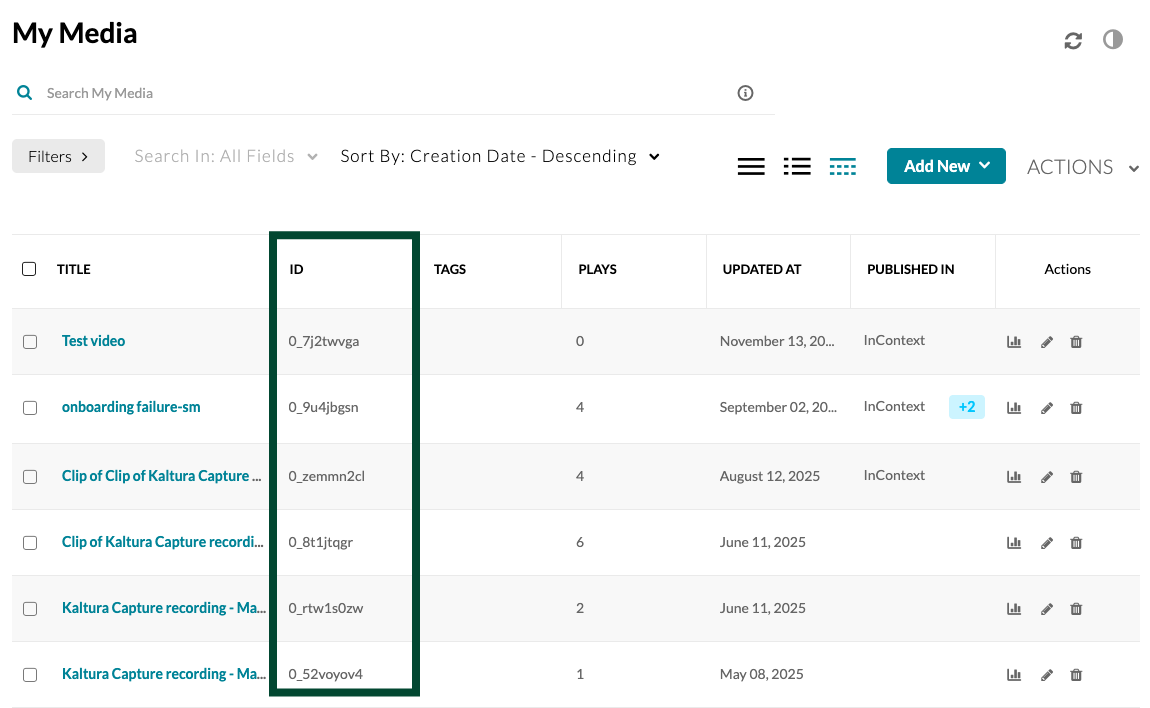 Inserting a Kaltura video into your H5P involves a step to build the URL for the video to include, or to download the video itself. To begin, you will need the Entry ID for the Kaltura video. This can be found in the Table View on your My Media page, displayed by clicking the third view option icon.