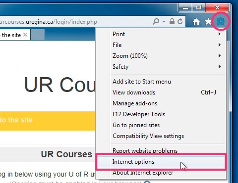 Open the Settings menu found in the browser toolbar area and select Internet options.