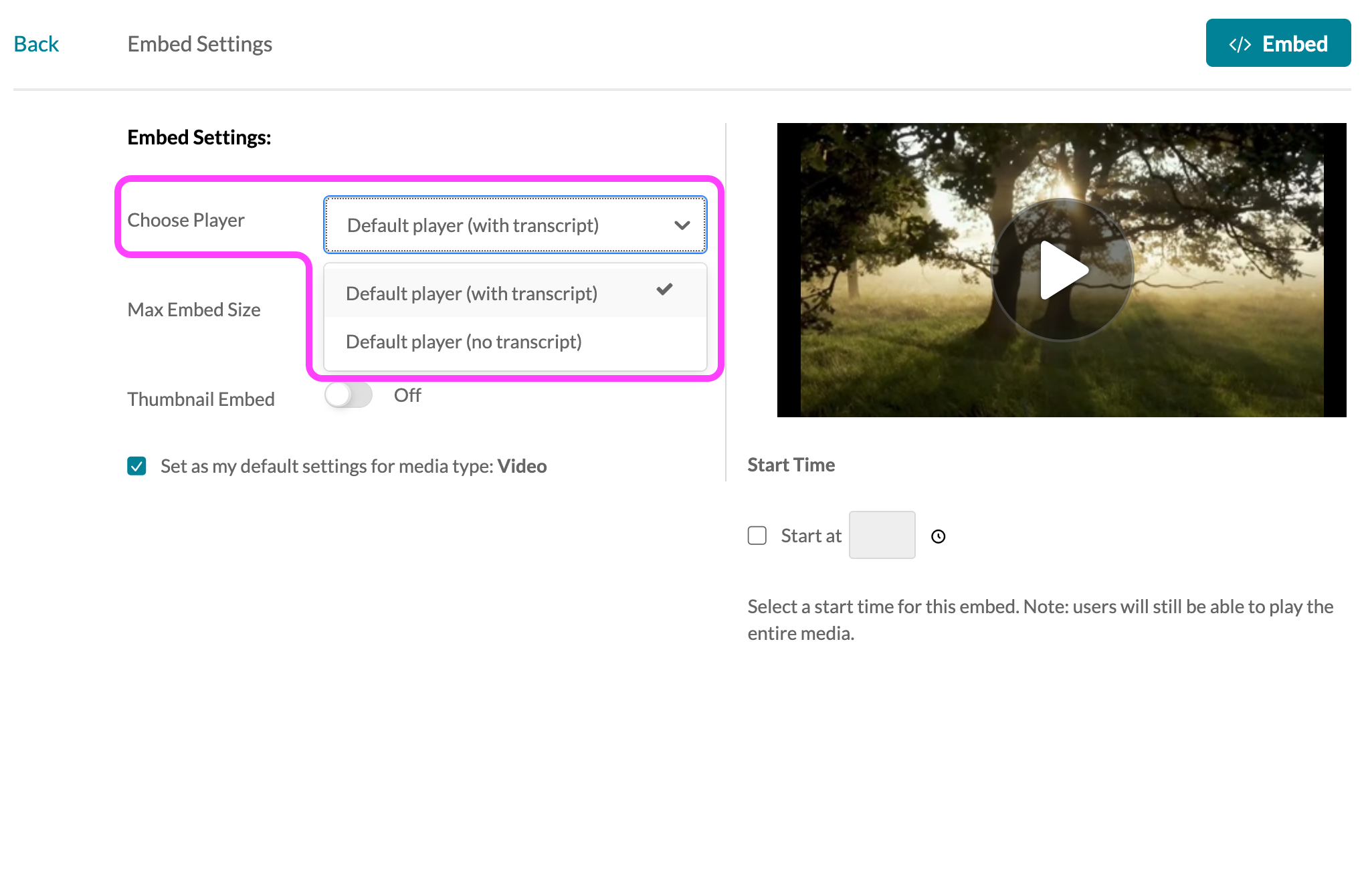 A new media player with the transcript option disabled is now available as an alternative to the default player. The new player can be selected by adjusting the embed settings when embedding media stored in My Media. Learn more