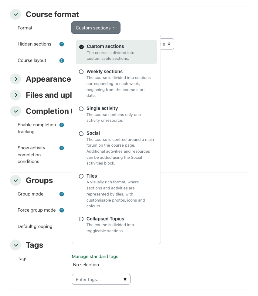 - Consult with course delivery specialists before using Tiles or Collapsed Topics formats