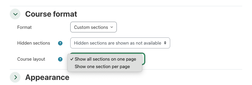 The Course Layout menu lets you select to show either all sections or a single section on the page.