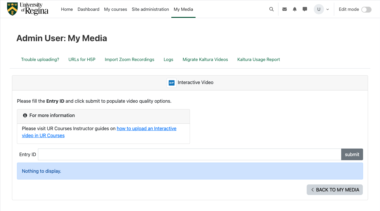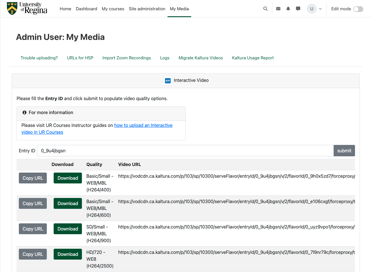 Next, click on URLs for H5P. Paste the Entry ID for your video in the input field, and click Submit.