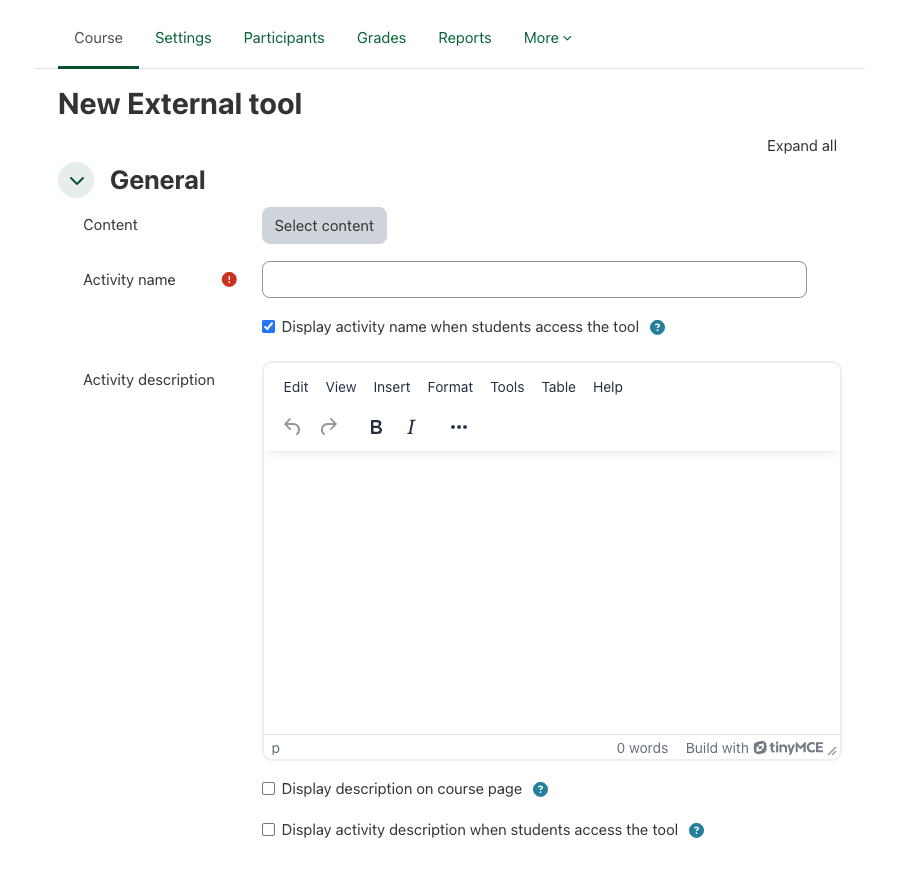 In UR Courses, put your course into Edit mode, and then add an activity to the section where you would like to include the Course Tools. Add the Macmillan Content activity, and configure the options on the New External Tool page.